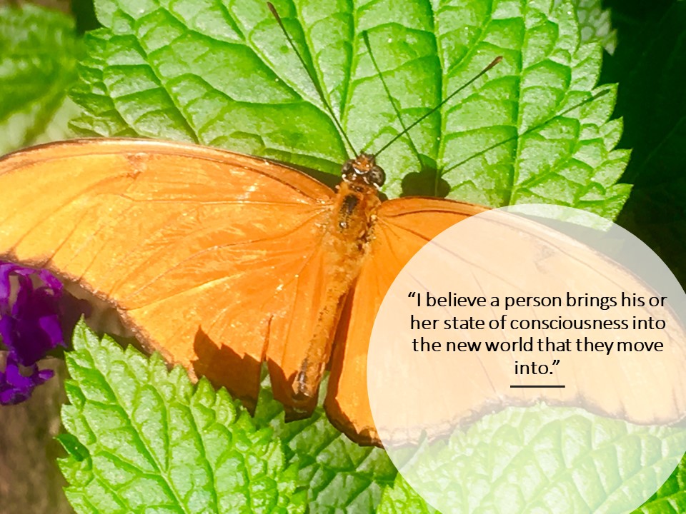I believe a person brings his or her state of consciousness into the new world that they move into. Our aspirations are recorded in our transcendental selves and therefore are taken anywhere we go.